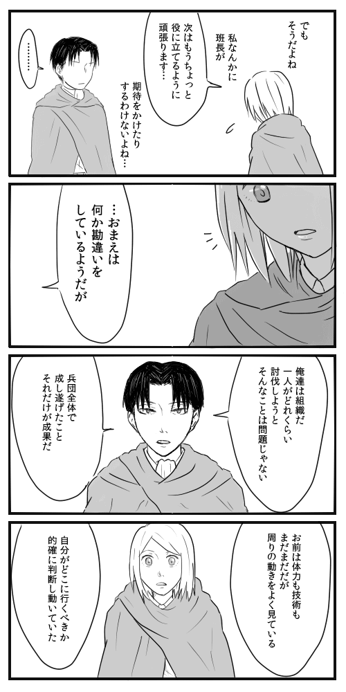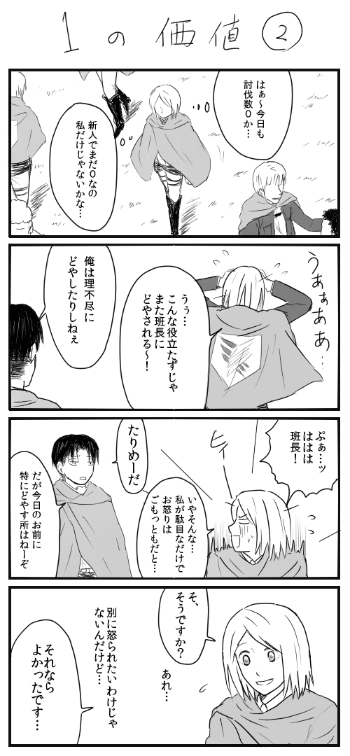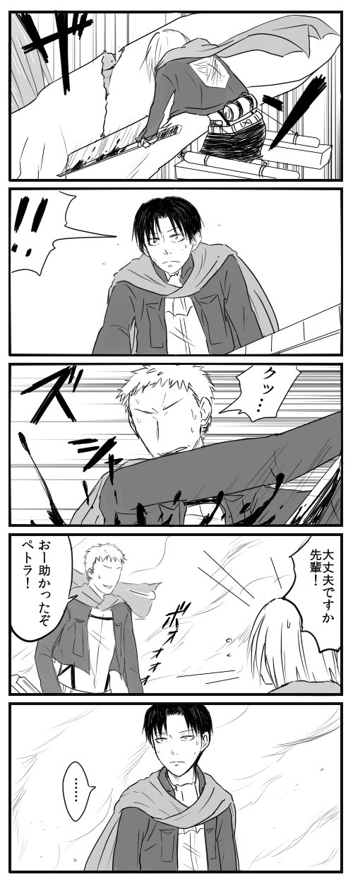 ペトラは俺が育てた⑩ 進撃:リヴァペト 2013年07月25日 左から右へどうぞ。(3P)・ペトラの討伐補佐数が多いことの裏話・6巻のペトラの「私達は組織で活動する」という言葉が兵長から 学んだことだったらいいなーというのを詰め込んだらこうなりました。次で一応最終話になる予定ですー PR