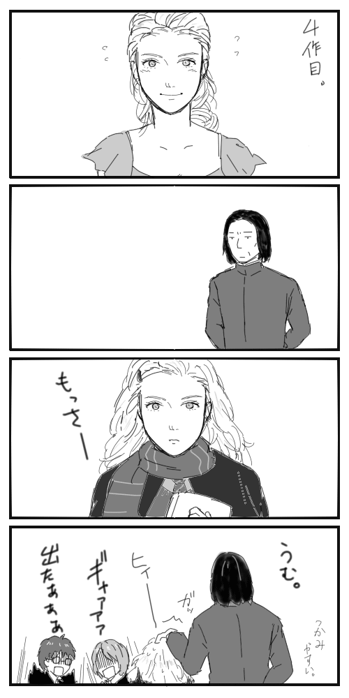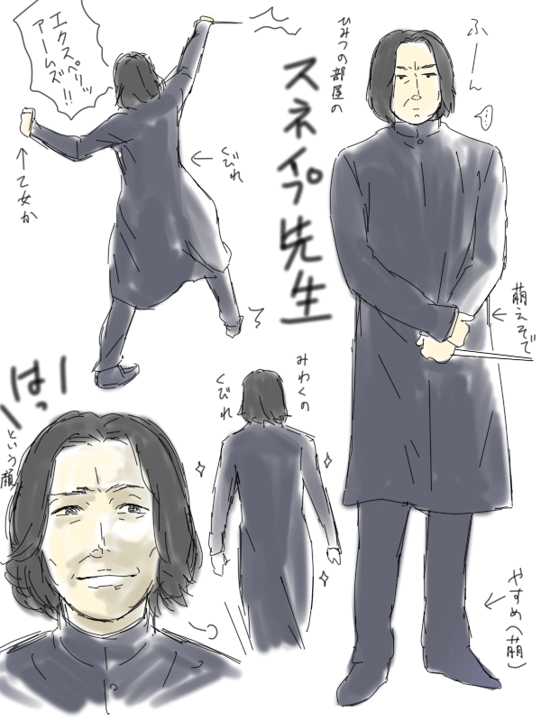 すねはー(ハリポタ) 雑多ジャンル 2015年06月11日 アアアーとうとう描いてもうた…(かろうじて落書き)金曜ロードショーで「ホワアアアアアスネイプセンセイマジカワユスー」となってピクシブ漁るまではよかったんですが、うっかり素敵すぎるスネハー小説読んでしまってどっぷりはまってしまってる現在。もうほんと素晴らしすぎる小説なんですよ…!私何でも原作至上主義なので、ハリポタに関してはスネリリ推しだしカプとしてはスネハーとかドラハー萌えるよねって程度だったんですけどいやほんと「これは独立した一つの作品と認めちゃいそうだな」ってくらいの出来だったもので私の中の萌えストッパーが壊れた;;(何を言ってるんだおまえは)うおおおお萌える…元々「不器用な男性キャラ(ツンデレ)」と「前向き一生懸命な女の子」ってカプドツボだからさ~あかんよこれは…萌え必至だよ…しかも年の差に教師と生徒とか萌え所多すぎてあかんですよね!映画で見たらぶっちゃけ「おじいちゃんと孫」レベルの年の差に見えるけどですね、公式では先生享年38歳ですからね!で、その時ハーさんは…えーと17か18歳?…うんいける!しかしマイナーすぎて泣きそう…まあはまるのも遅かったけどさ…あと「秘密の部屋」観て思ったけど、決闘クラブ?のシーンのスネイプ先生のかっこよさヤバス…あの黒ずくめ衣装もやばいが振る舞いすべてがエロい…なんだあの人…録画永久保存した…