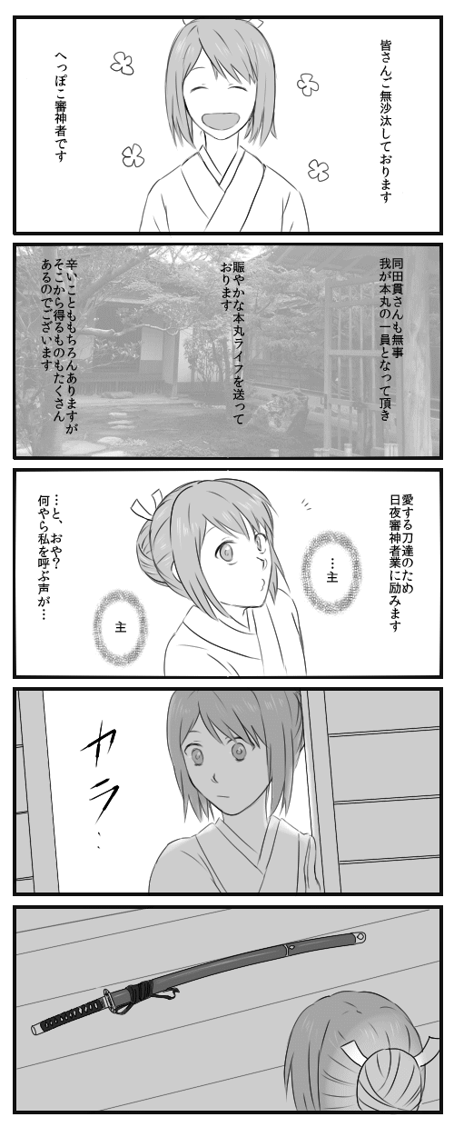 【刀剣】あの子のはなし 刀剣乱舞 2016年06月10日 ようやっと描き始めました。「同田貫のあるじ」の番外編になります。需要なくても気にしない。これ描かないと終わった気がせんのだ…前のを描いてる時に大体のネームは出来てたんですが推敲し直したらどうにも納得いかない点が出てきて結局大幅に修正したので着手にかなり時間がかかったのでした…5コマ漫画で15ページくらいになりそうです。相変わらず面倒くさい漫画になるし人を選ぶ感じなのでまあ心の広い方だけどうぞ…のんびーり描きます。