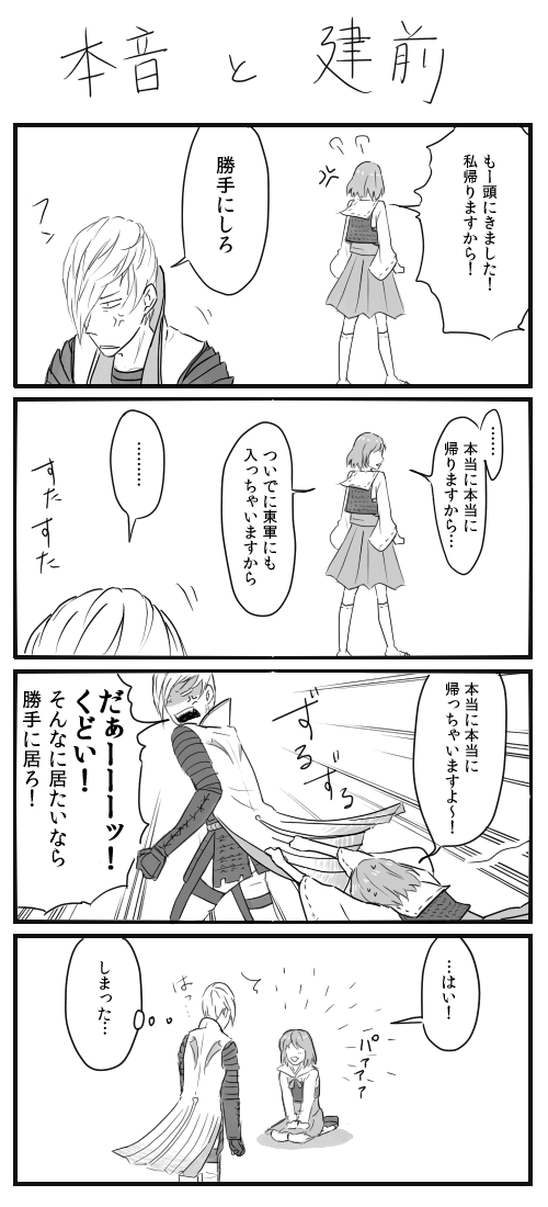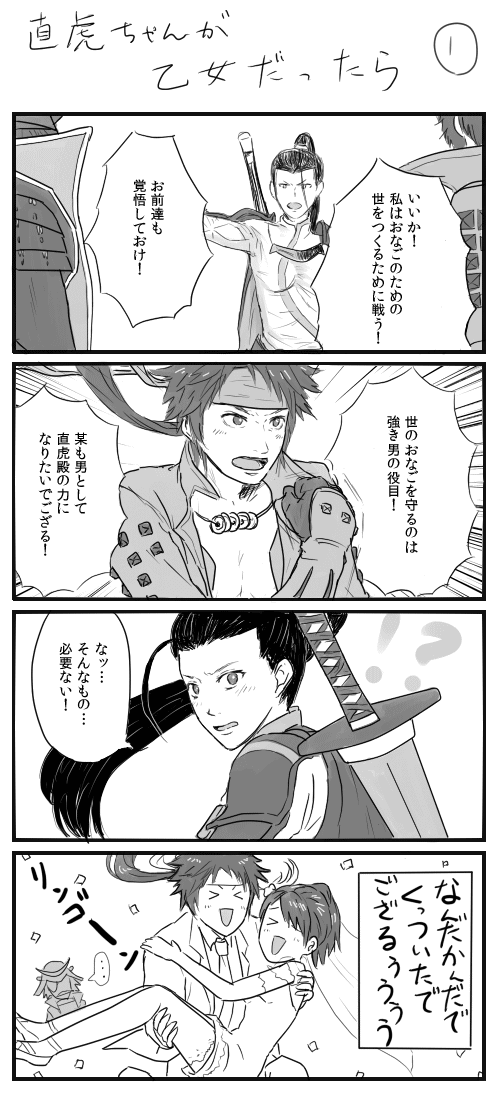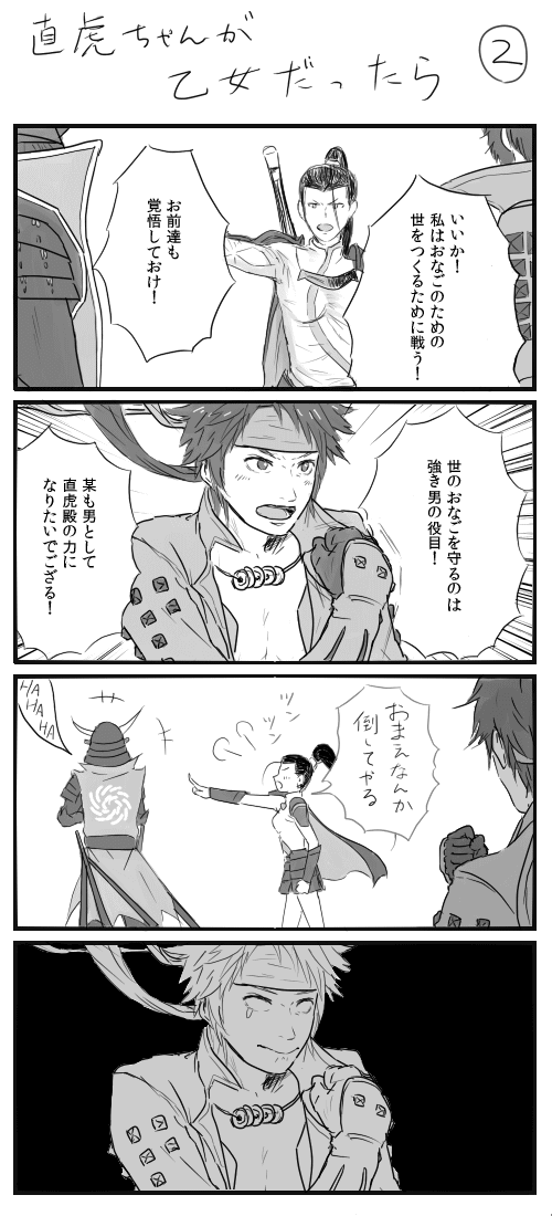 直虎ちゃんの公式画像妄想① BASARA:ノマカプ 2013年12月03日 完全に私だけが描いてて楽しい漫画です突発思いつきネタなんですけど、描いてて案外この二人いいんじゃない?尻に敷いてそうで実は年下男子(決めつけ)に振り回されてるツンデレ直虎ちゃんとか…意外といいんじゃない…?という結論に至りました。そう思えてくると公式のいくつかの画像も直虎ちゃんと幸村が意外と一緒に写ってて公式も推してるんじゃない…?とか思えてきます。病気です。いやでも…いいんじゃない…?(呪