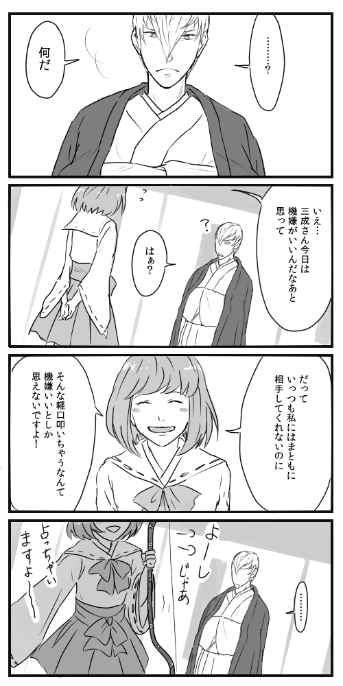 三鶴漫画③ BASARA:ノマカプ 2013年11月25日 左から右へどうぞ。優しいっていうかイイ人な三成さん。なんだかんだいいつつ鶴さんに付き合ってたらいいな。・鶴さんが西軍に入ってまもなく・西軍拠点のある城内での出来事 ってことで……ここまで描いた分後ほどピクシブ上げますー