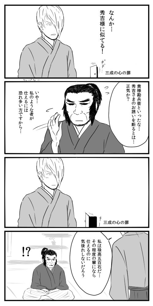 佐和山は今日も平和です⑤ BASARA 2014年01月08日 あながちイメージ間違ってない。やっと休みが来たのでうおおおおと一気に描きました。もうバサラのキャラを借りた史実漫画と化してきました。ウィキぺ見てると三成さんは不器用っていうか自分にも他人にも厳しい人って感じがします。ストイック!!三成さん周辺の人は大谷さんしかり左近しかり、そんな彼の性格を欠点じゃなくて美点と認められる人だったんだろうなーと思います。佐和山楽しい。以下この前見た「の、ぼ、う、の、城」の感想 つづき