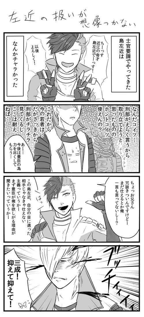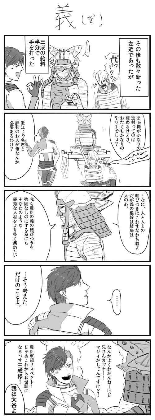 佐和山は今日も平和です① BASARA 2013年12月29日 左近の参戦知った時から温めてた佐和山主従漫画です。三鶴漫画の方とは全く関係ないです。あれも描きたいネタまだ残ってるけどこっちは発売前に描いとかないともう描く機会ないなと思って…思いつきネタで構成されたギャグ4コマおにゃのこが出ないまあ私の漫画なので腐要素はないです