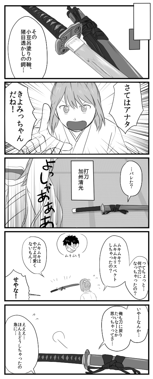 【刀剣】あの子のはなし 刀剣乱舞 2016年06月10日 ようやっと描き始めました。「同田貫のあるじ」の番外編になります。需要なくても気にしない。これ描かないと終わった気がせんのだ…前のを描いてる時に大体のネームは出来てたんですが推敲し直したらどうにも納得いかない点が出てきて結局大幅に修正したので着手にかなり時間がかかったのでした…5コマ漫画で15ページくらいになりそうです。相変わらず面倒くさい漫画になるし人を選ぶ感じなのでまあ心の広い方だけどうぞ…のんびーり描きます。