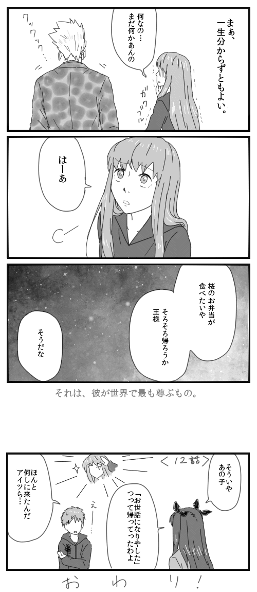 オワッタアアアア fate関連 2015年05月30日 王様と雑種の不思議な旅 後編 by うらごし on pixivやっと終わりました~ぴくしぶに上げております。申し訳程度のおまけしかつけれませんでした…ここで読んだ方にはあまり目新しいものないです すいません…計31枚!重いかも…見直すと絵が酷過ぎて青ざめましたが、まあ熱意だけは溢れているので…ギルガメッシュルートの「ここが好きなんだよ!!」っていう面をつめこめるだけつめこみました。満足…噛みあってるんだが噛みあってないんだかって感じの二人をめいっぱい描けてもう思い残すことはないです。本当に読んでいただいた方、ありがとうございました。